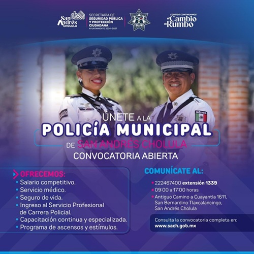 Con esta convocatoria, el Gobierno Municipal de San Andrés Cholula busca incrementar el estado de fuerza de la SSPPC, con el objetivo de mejorar la atención y la seguridad de la población sanandreseña y de sus visitantes.